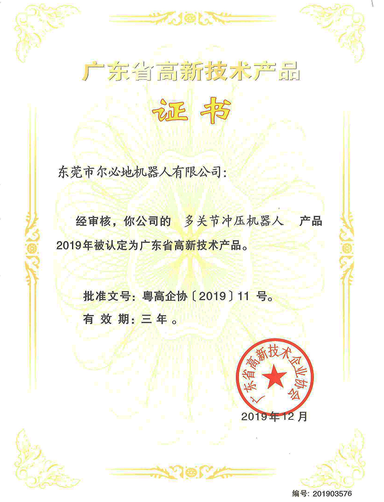 東莞市爾必地機器人有限公司在全體員工的共同努力下,經過嚴格的層層審查,最終喜獲由廣東省高新技術企業協會頒發的《廣東省高新技術產品證書》,此次獲得高新技術產品認定的產品有六個,分別是“可轉向噴涂機械手”、“多關節防爆噴涂機器人”、“拖動示教噴涂機器人”、“多關節碼垛機器人”、“多關節沖壓機器人”、“六軸噴涂機械手”。